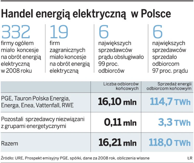 Rynek, jaki zdołały zdobyć dotychczas niezależni sprzedawcy prądu, nie jest wielki. W 2008 roku ich udział wynosił około 3 proc. sprzedaży energii elektrycznej dla odbiorców końcowych. Stopniowo będzie jednak rósł. Powód: najwięksi gracze tracą zwykle część odbiorców, wybierając strategię utrzymania wysokich zysków kosztem udziałów rynkowych.