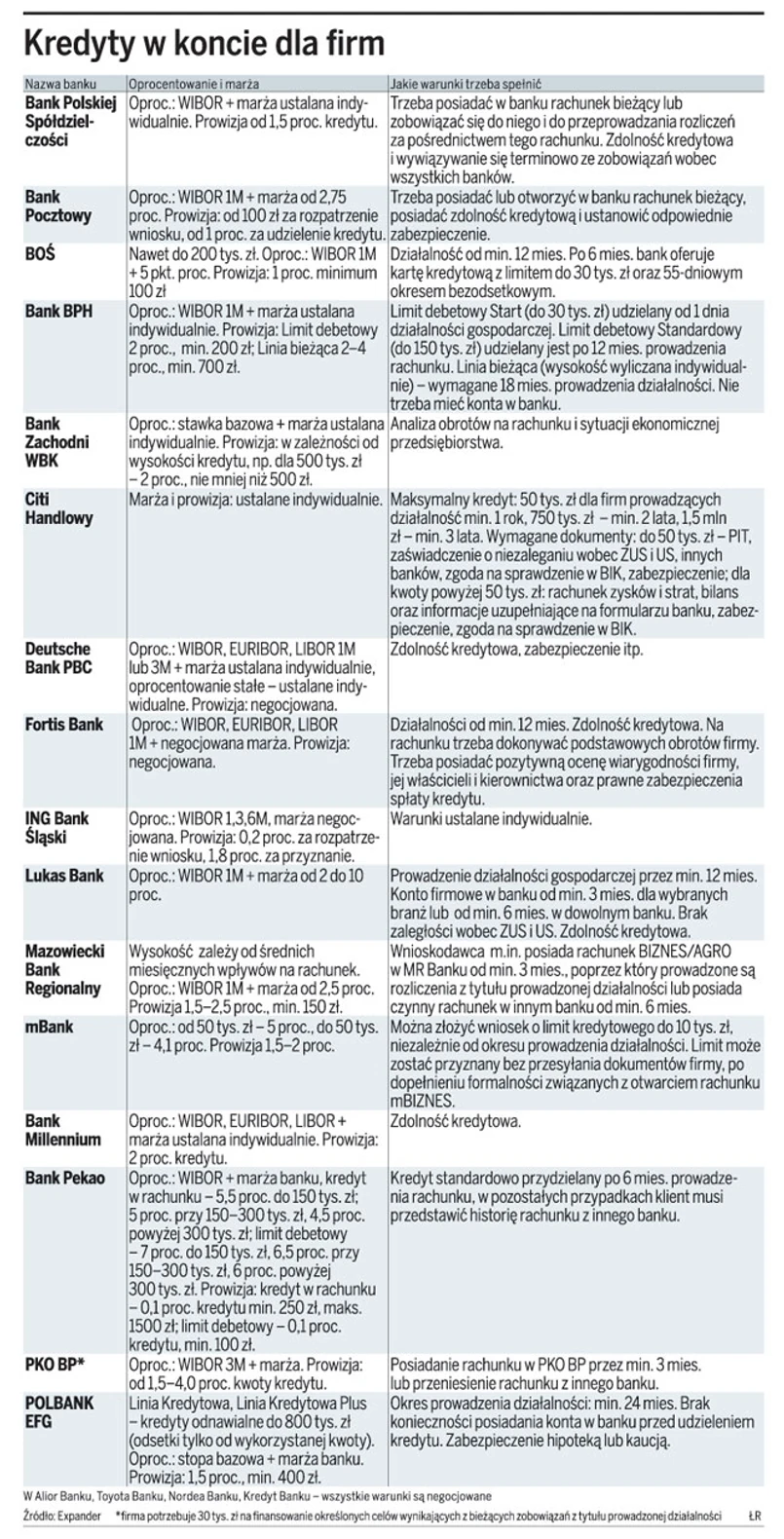 Z zestawienia przygotowanego przez Expander wynika, że w wielu bankach przedsiębiorca może liczyć na finansowanie, jeśli jego firma przetrzyma najtrudniejszy pierwszy okres, znajdzie odbiorców i będzie miała w miarę stabilne dochody.