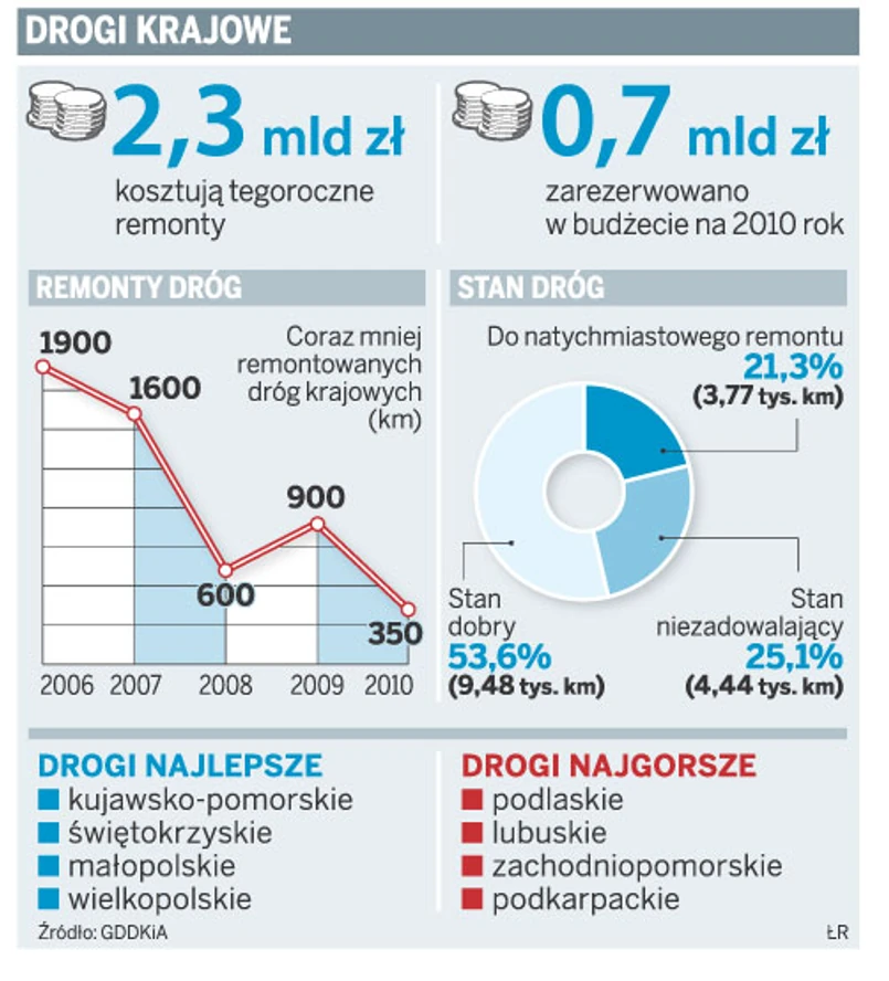 Ponad 3,7 tys. tras krajowych (21,3 proc. sieci) jest w tak fatalnym stanie, że kwalifikuje się do natychmiastowego remontu. Potrzeba na to ponad 3,6 mld zł. W projekcie budżetu na 2010 rok na modernizacje tzw. krajówek znalazło się jedynie niecałe 700 mln zł.