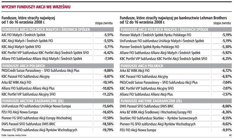 Spadki bezpośrednio odbijają się na wynikach funduszy inwestujących większość środków w akcjach. Od początku tego miesiąca do 16 września fundusze akcji polskich i zagranicznych straciły od 5 do ponad 8 proc. Ich straty mogły się pogłębić po dalszej wyprzedaży akcji w środę. Wśród inwestujących za granicą do połowy miesiąca największe straty poniosły głównie fundusze lokujące środki w krajach rozwijających się, w tym tzw. Nowej Europie oraz BRIC (Brazylia, Rosja, Indie, Chiny).