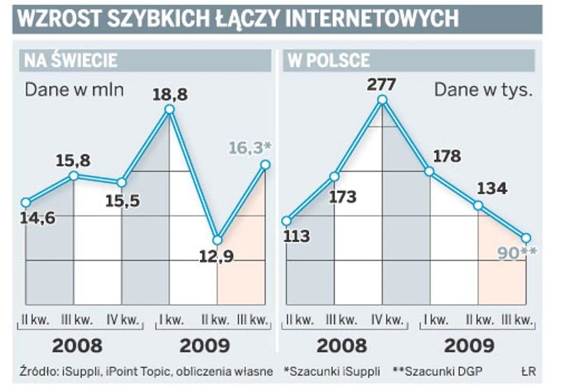 Według wstępnych danych firmy iSuppli, wzrost liczby nowych łączy szerokopasmowych od lipca do końca września tego roku był o około 500 tys. większy niż w tym samym okresie 2008 roku. Według szacunków DGP w Polsce natomiast wzrost był niemal o 50 proc. niższy niż rok wcześniej.
