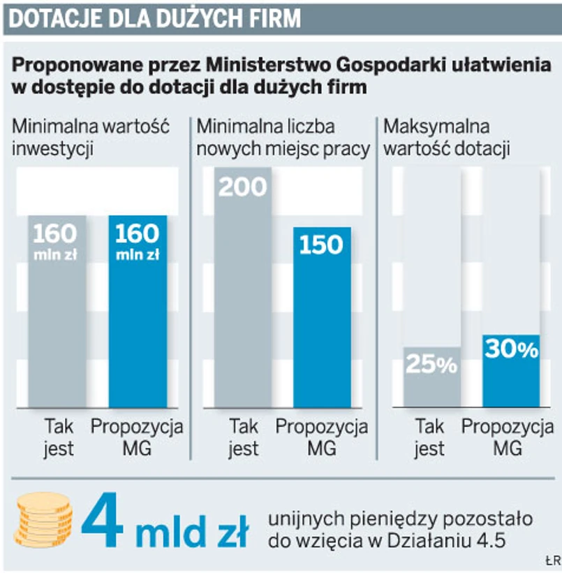 Ministerstwo Gospodarki przygotowało projekt rozporządzenia, które ułatwi dużym firmom dostęp do unijnych dotacji na inwestycje. Aby dostać pieniądze, będą musieli oni m.in. stworzyć mniej nowych miejsc pracy.