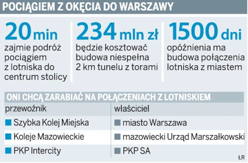 Gdyby nie czteroletnie opóźnienie w budowie kolejowego połączenia portu lotniczego na Okęciu z centrum Warszawy, pociągi na tej trasie woziłyby pasażerów już od miesiąca. Inwestycja przebiega jednak w ślimaczym tempie i dopiero w tym miesiącu ruszyła budowa niespełna 2 km torów w tunelu, które połączą gotową od dwóch lat podziemną stację pod Terminalem 1 ze zmodernizowaną linią radomską w kierunku Warszawy. Budowa za 234 mln zł zakończy się w połowie 2011 roku.