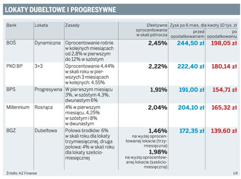 Coraz więcej jest w bankach lokat, w których stosuje się różne stawki oprocentowania. W ubiegłym tygodniu BGŻ wprowadził do swojej oferty lokatę dubeltową.