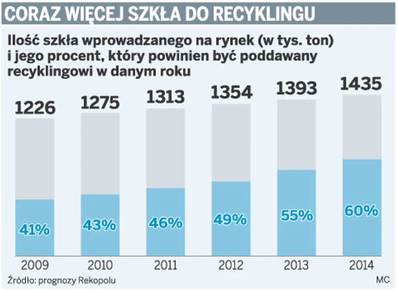– W tym roku 41 proc. szkła, jakie trafi na rynek, musi zostać poddane recyklingowi. Faktycznie obowiązek jest realizowany na poziomie 30–34 proc. W 2014 roku wymóg wzrośnie do 60 proc., a jeśli nic się nie zmieni realnie osiągniemy najwyżej 40–50 proc. – mówi ekspert Rekopolu.