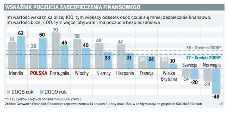 Spośród objętych tegorocznym badaniem 14 krajów Europy oraz Stanów Zjednoczonych nasz kraj jest drugim po Irlandii z najgorszym wskaźnikiem poczucia braku zabezpieczenia finansowego. Dla Polski wynosi on 60 pkt, a im bliżej 100 pkt, tym gorzej. Co istotne, pogorszył się on o 22 pkt, w porównaniu z danymi ubiegłorocznymi, choć w większości pozostałych badanych krajów sytuacja uległa poprawie.