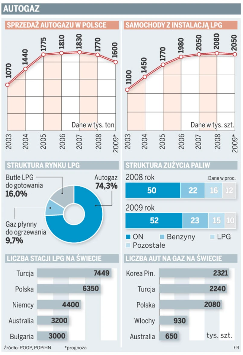 Rynek autogazu lata świetności ma już za sobą. Po III kwartałach 2009 r. sprzedaż LPG spadła o ponad 7 proc. w stosunku do tego samego okresu 2008 r. Analitycy szacują, że na koniec roku zużycie tego paliwa zmniejszy się nawet o 10 proc. Bardziej zachowawcze prognozy mówią o 6-proc. spadku.