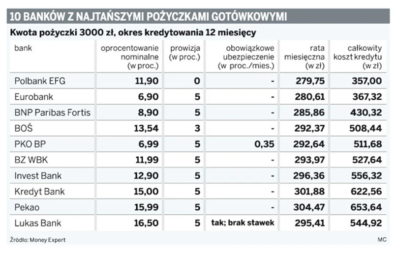 A ten bywa bardzo różny. W Polbanku nie trzeba płacić prowizji od udzielonego kredytu i nie ma obowiązkowego ubezpieczenia, więc kredyt jest najtańszy. Spłacając pożyczkę w wysokości 3 tys. zł na rok, musimy oddać w sumie 3357 zł (całkowity koszt kredytu to 357 zł). O 10 zł więcej zapłacimy za kredyt w Eurobanku, gdzie oprocentowanie nominalne jest wyraźnie niższe, ale trzeba zapłacić marżę.
