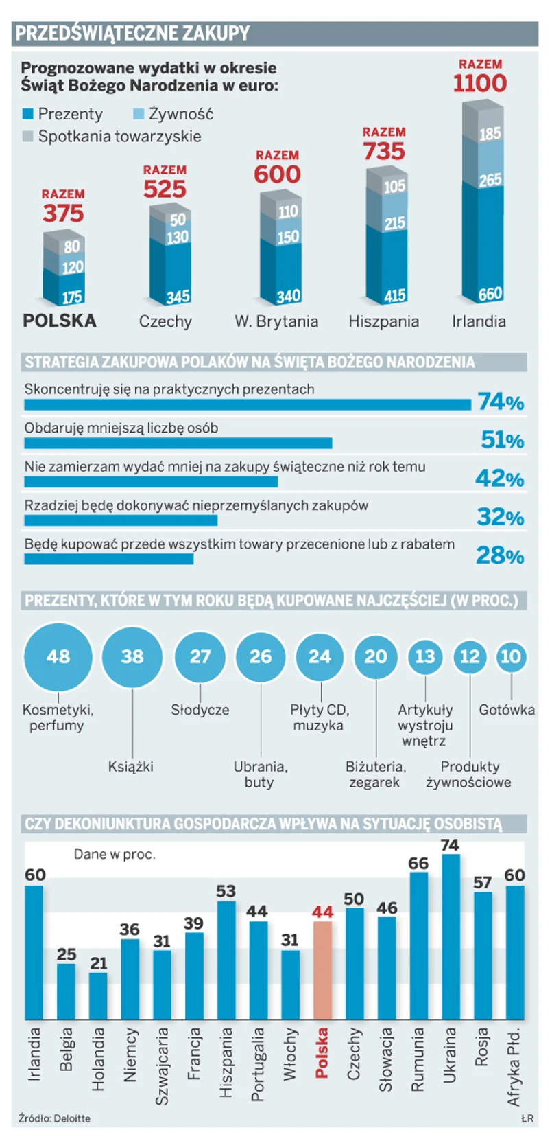 Z badań przeprowadzonych przez Deloitte wynika, że aż 61 proc. Polaków deklaruje wydanie w sklepach tyle samo lub nawet więcej pieniędzy niż w ubiegłym roku. Średnio wydatki na rodzinę mają sięgnąć 1,5 tys. zł. Jednak aż 28 proc. konsumentów przyznaje, że nastawia się wyłącznie na zakup towarów przecenionych.