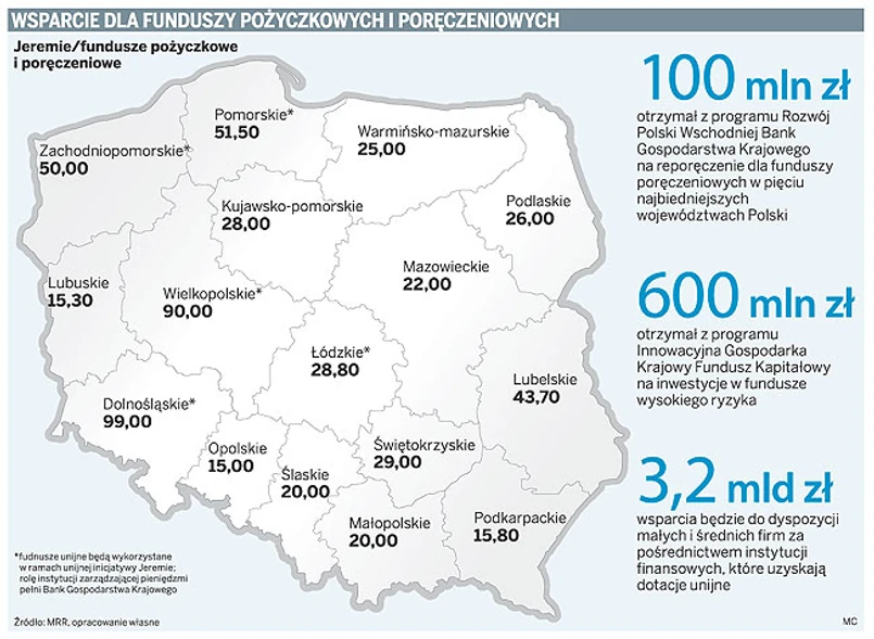 W ramach regionalnych programów operacyjnych jest prawie 580 mln euro na wsparcie dla tego typu instytucji. Jak mówi Ryszard Nosowicz, prezes Krajowego Stowarzyszenia Funduszy Poręczeniowych, w większości województw zakończyły się już konkursy, które miały podzielić unijne środki między zainteresowane fundusze. Dodatkowo w pięciu regionach będą one dystrybuowane przez BGK w ramach inicjatywy Jeremie.
