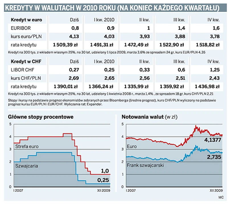 To oczywiście oznacza wyższe raty dla posiadaczy kredytów, ale z odsieczą może im przyjść wzmacniający się złoty. Dobra kondycja gospodarki i relatywnie wysokie stopy procentowe mogą skłaniać światowych inwestorów do zakupów polskiej waluty. Dlatego ekonomiści nie mają wątpliwości – w 2010 roku złoty umocni się do euro i do franka o ok. 10 proc.
