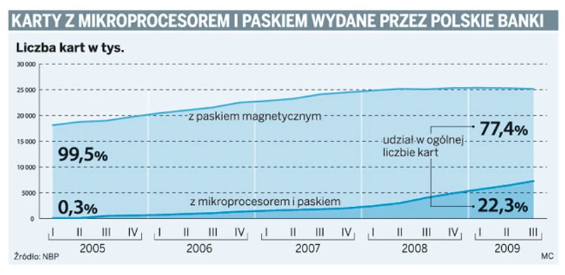 Dodaje, że cały proces kosztował bank kilka milionów euro. Dziś można to wykonać nieco taniej, bo jak tłumaczy Krzysztof Muszyński z MultiBanku, producenci (tacy jak np. francuski Gemalto, największy producent mikroprocesorów do kart) obniżyli nieco ceny. Być może dojdzie do takiej sytuacji, kiedy karty z paskiem – ze względu na niewielkie zamówienia – będą coraz droższe – prognozuje specjalista od kart z MultiBanku. Ale i tak banki nad wyraz mocno dbające o koszty w kryzysie mogą nie być skore do szybkiej wymiany. Tym bardziej że i sankcje nie wydają się odstraszające – oczywiście Visa czy MasterCard usilnie namawiają banki do zmiany, ostrzegając, że będą pobierały większe prowizje za transakcje bezgotówkowe wykonane przy pomocy kart z paskiem. Ale jest to niewystarczający bodziec, tym bardziej że dziś prowizje przy użyciu kart czipowych, które banki odprowadzają do organizacji płatniczych, są tylko minimalnie niższe.