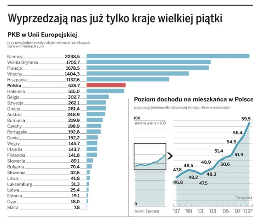 W kończącym się właśnie roku, jak podaje Eurostat, dochód narodowy Polski przy uwzględnieniu tego, co rzeczywiście możemy kupić w naszym kraju za euro, wyniesie 535 mld euro. To wyraźnie więcej, niż w tym czasie wypracowała 17-milionowa Holandia (515 mld euro). Przed nami znalazły już tylko kraje tzw. wielkiej piątki, czyli państwa, których liczba ludności jest wyraźnie większa niż Polski: Niemcy, Wielka Brytania, Francja, Włochy i Hiszpania.
