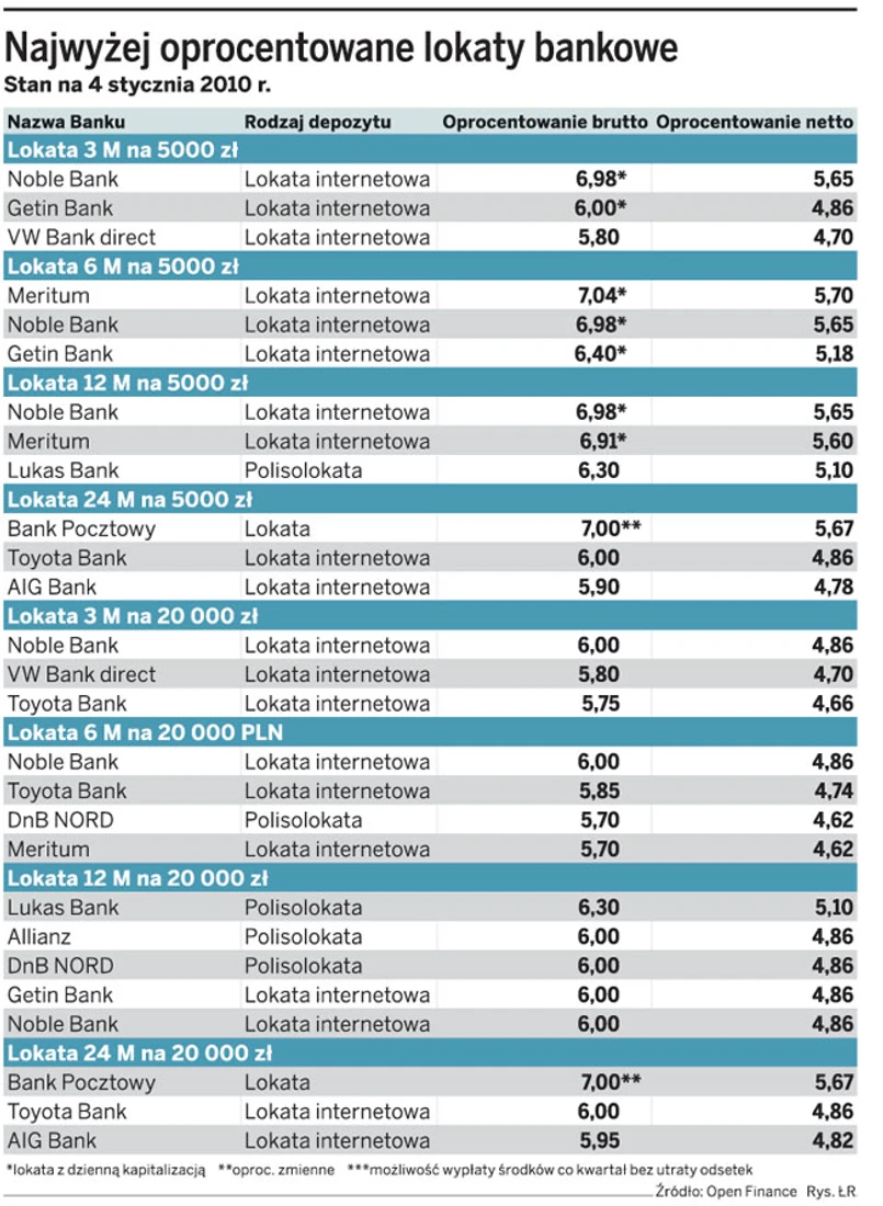 W porównaniu z początkiem ubiegłego roku, obecne oprocentowanie lokat jest znacznie niższe. Na początku 2009 roku banki, które miały problemy finansowe i potrzebowały płynności, oferowały nawet dwucyfrowe oprocentowanie. Był to okres wojny depozytowej, która dla wielu instytucji finansowych była bardzo kosztowna. Dzisiaj tylko Bank Pocztowy i Meritum Bank oferują oprocentowanie na poziomie 7 lub nieco więcej procent (realny zysk z takich lokat wynosi mniej niż 6 proc.) – wynika z rankingu przygotowanego przez Open Finance.