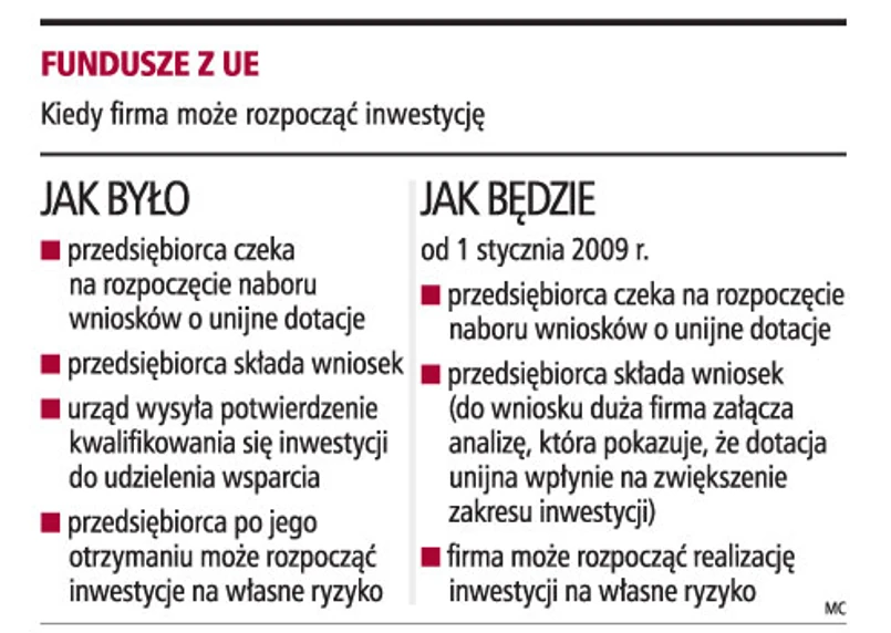 Przedsiębiorcy będą mogli rozpocząć inwestycję tuż po złożeniu wniosku o dotację - wynika z nowych przepisów. Zmiany zaczną obowiązywać w Polsce najpóźniej od początku 2009 roku.