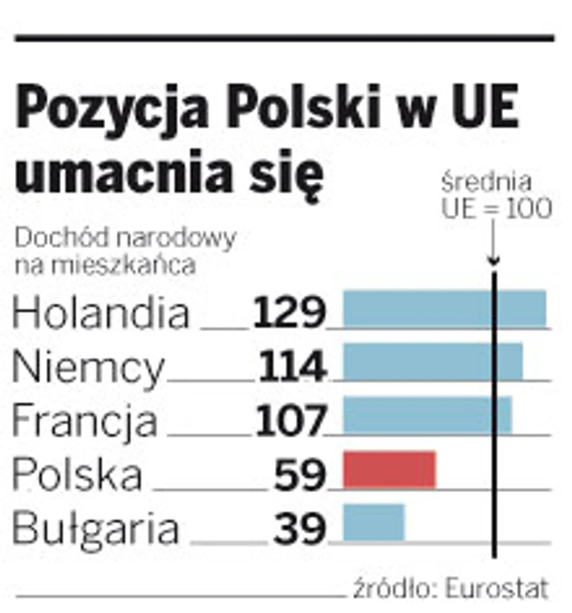 Jak dotąd nasz kraj broni się przed kryzysem. O ile jeszcze w 2007 r. dochód narodowy na mieszkańca przy uwzględnieniu realnej siły nabywczej złotego wynosił w naszym kraju 54,4 proc. przeciętnej UE, to w tym roku jest to już 59 proc. Zdecydowanie wyprzedziliśmy trzy republiki bałtyckie. Niewiele brakuje nam także do Węgier, gdzie dochód przeciętnego mieszkańca wynosi teraz 60,9 proc. średniej europejskiej.