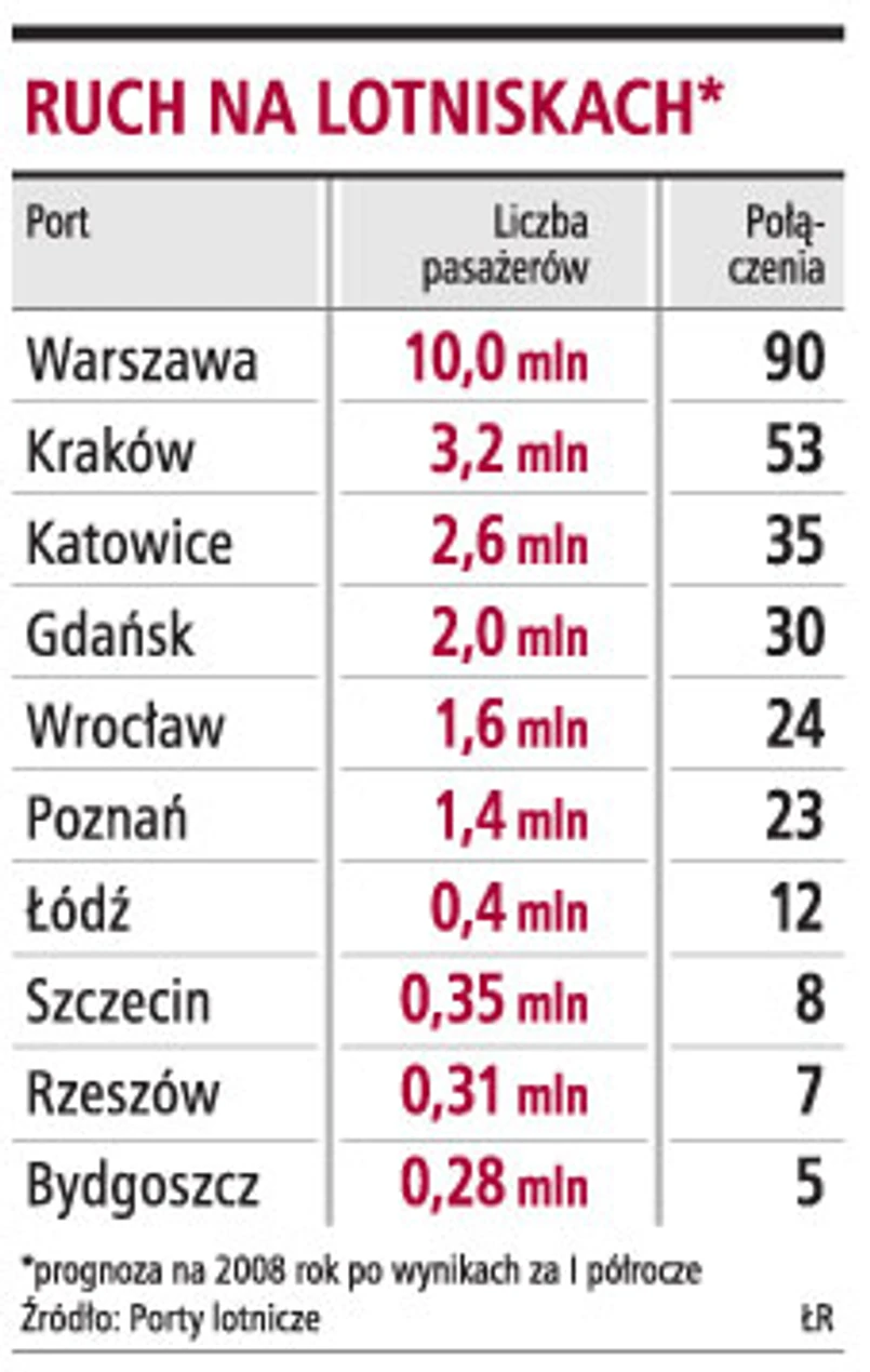 Warszawskie Okęcie po trwającej cztery lata rozbudowie już za rok stanie się zbyt małe. Jeśli sprawdzą się tegoroczne prognozy, stołeczny port obsłuży 10 mln pasażerów. Bez budowy drugiej drogi startowej lub rozbudowy infrastruktury lotniskowej przepustowość lotniska już się nie zwiększy. Porty w Krakowie, Katowicach, Gdańsku oraz Poznaniu razem mają tylu pasażerów, ilu ma Warszawa, ale one także zbliżają się do osiągnięcia granic przepustowości. Żeby temu zapobiec, tylko do 2012 roku planują zainwestować ponad 1 mld zł.