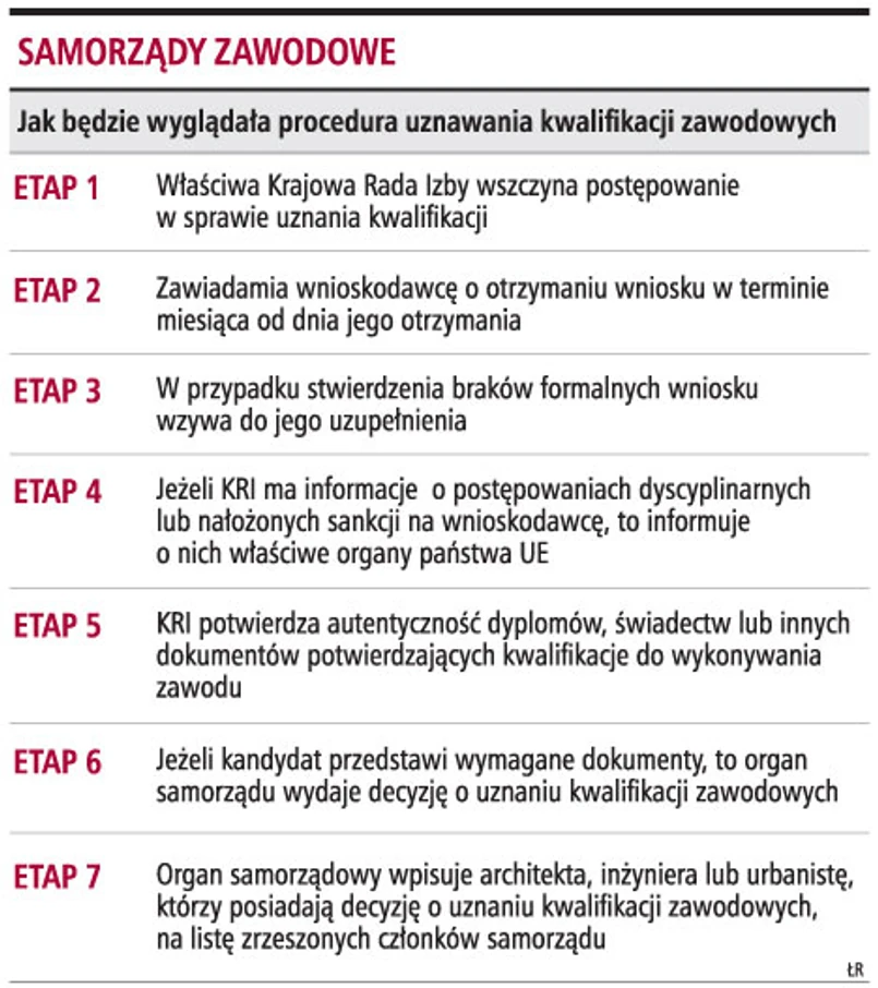 Projekt ustawy usprawnia procedurę uznawania uprawnień zawodowych inżynierów, architektów i urbanistów, którzy chcą tylko okazjonalnie wykonywać jakieś usługi. Przed rozpoczęciem świadczenia ich po raz pierwszy będą oni zobowiązani do przedłożenia radzie izby pisemnego oświadczenie o takim zamiarze. Ma ono zawierać informacje o rodzaju planowanych czynności zawodowych, miejscu i przybliżonym terminie ich rozpoczęcia oraz ubezpieczeniu. Zainteresowany będzie musiał dołączyć dokument potwierdzający obywatelstwo oraz zaświadczenie właściwego organu samorządu potwierdzające, że faktycznie i zgodnie z prawem wykonuje swój zawód i nie obowiązuje go zakaz jego wykonywania.