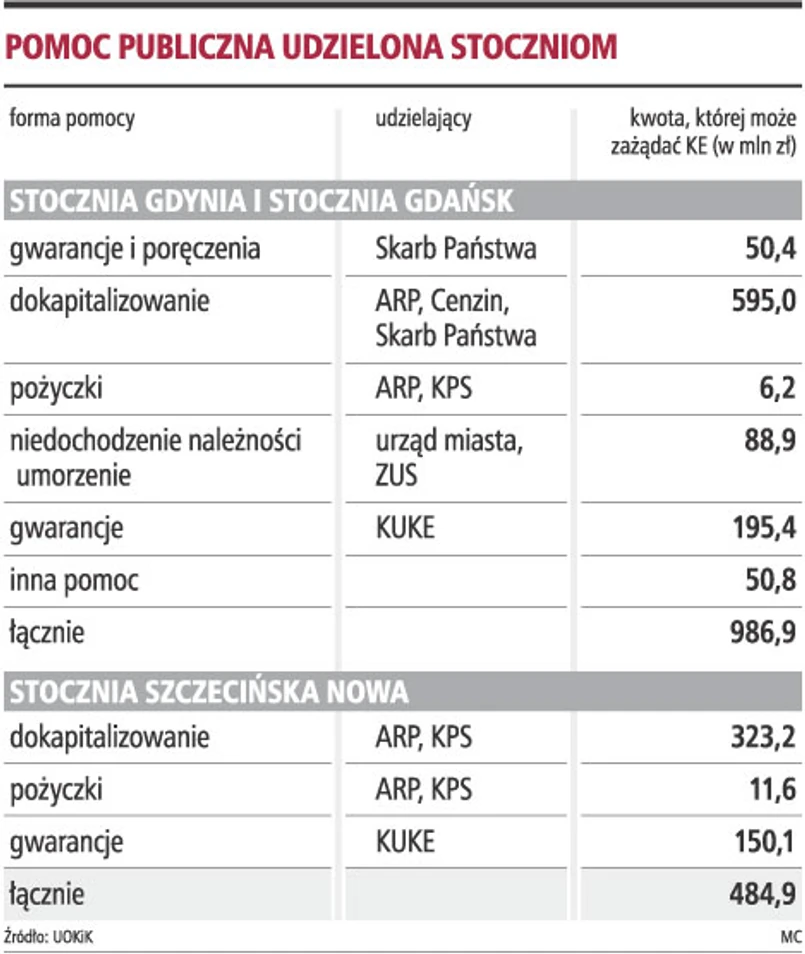 Nominalna kwota pomocy publicznej udzielonej trzem stoczniom przekracza 8,5 mld zł, ale według wyliczeń Urzędu Ochrony Konkurencji i Konsumentów suma, której zwrotu mogłaby zażądać Komisja Europejska od stoczni (jeśli odrzuci plany restrukturyzacji przedstawione przez resort skarbu), nie przekracza 1,5 mld zł.