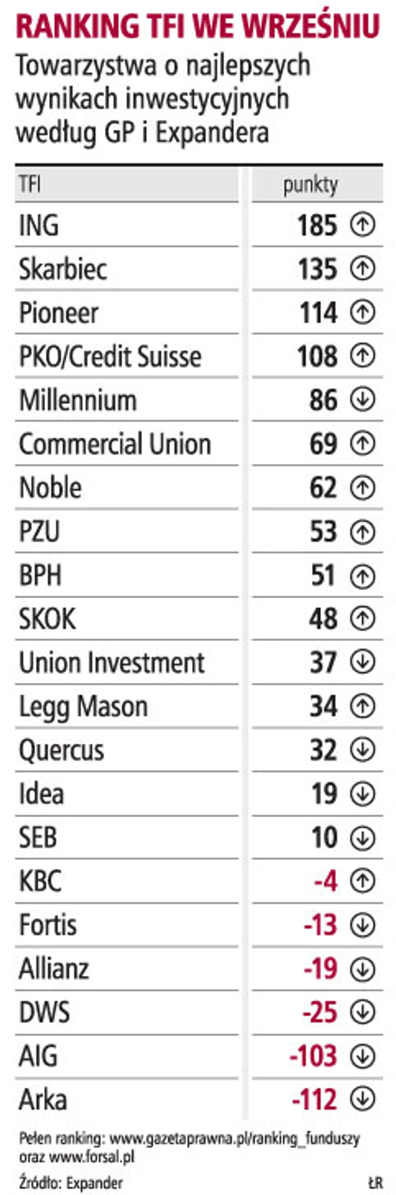 Wrzesień był kolejnym miesiącem, który przyniósł duże zmiany w rankingu GP i Expandera. Dzięki wynikom m.in. ING Parasol SFIO subfundusz Środkowoeuropejski Sektorów Defensywnych Plus oraz ING Parasol SFIO subfundusz Środkowoeuropejski Sektorów Wzrostowych Plus, na pierwszym miejscu znalazło się ING TFI (185 pkt). Najgorzej wypadło BZ WBK AIB TFI (-112 pkt), które straciło w rankingu z powodu wyników m.in. Arka BZ WBK Energii FIO oraz Arka BZ WBK Akcji FIO.