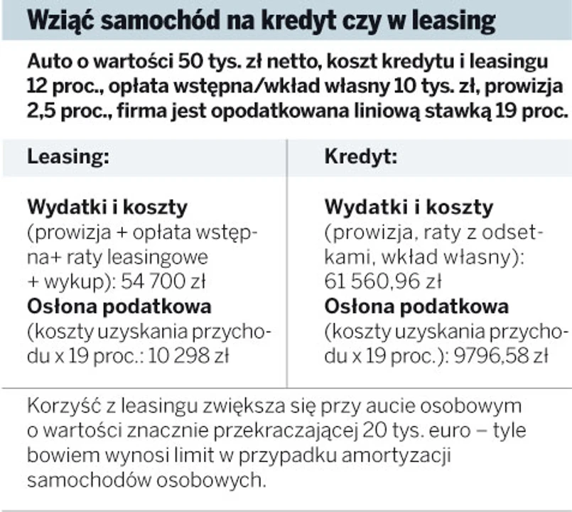 ● mniejsze niż w przypadku leasingu koszty uzyskania przychodu (odpisy amortyzacyjne, codzienne koszty użytkowania, prowizje bankowe związane z zaciągnięciem kredytu);