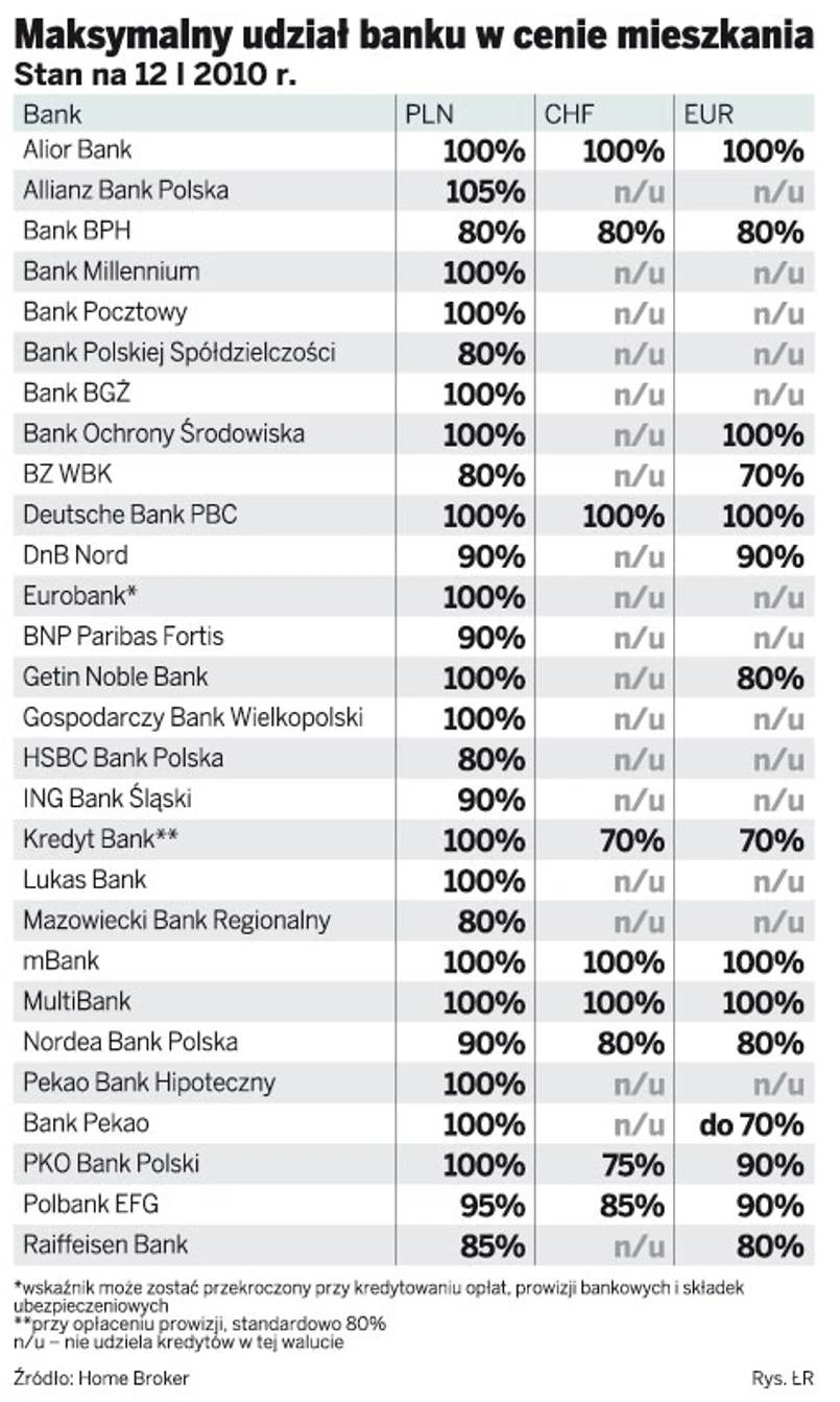 Ograniczenia przy liczeniu zdolności kredytowej to nie-jedyne, jakie napotka się, poszukując kredytu hipotecznego w walutach obcych. Innym jest tzw. LTV, czyli wymagany poziom środków, jakimi dysponuje przyszły nabywca nieruchomości. O ile w przypadku kredytów złotowych większość banków powróciła już do pełnego finansowania zakupów, to kredyty walutowe dalej mają w tym względzie ograniczenia. Są one jednak coraz mniejsze i większość banków najwyraźniej uznało, że ryzyko wahań kursowych oddala się. Prawdopodobnie ma na to wpływ również perspektywa wejścia Polski do strefy euro i nieodległe zapewne włączenie naszej waluty do mechanizmu ERM II.