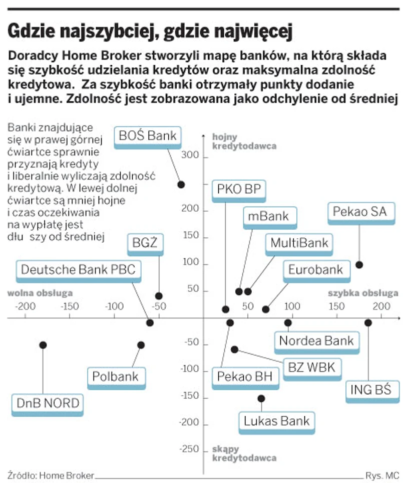 Wspólnie z Home Broker Doradcy Finansowi postanowiliśmy sprawdzić, w których bankach procedura związana z ubieganiem się o kredyt zajmuje najmniej czasu. Nasze zestawienie powstało na podstawie opinii doradców. Oceniali oni czas rozpatrywania wniosków w poszczególnych bankach, klasyfikując je jako szybkie (od momentu złożenia kompletu dokumentów do wypłaty środków – do dwóch tygodni), średnie (od 15 dni do miesiąca) i wolne (powyżej miesiąca). Po zsumowaniu wyników i odrzuceniu banków o stosunkowo niskiej liczbie wskazań otrzymaliśmy ranking według szybkości załatwiania wniosków.