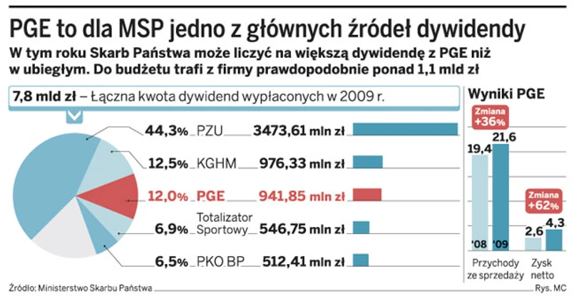 Największy producent prądu w Polsce, do którego należy około 40 proc. rynku, zarobił w ubiegłym roku na czysto ponad 4,3 mld zł, o 62 proc. więcej niż rok wcześniej. Zarząd proponuje, żeby znaczną część tej kwoty podzielić między akcjonariuszy. To o tyle zrozumiałe, że głównym udziałowcem jest Skarb Państwa, jego potrzeby są niemałe, a PGE należy do największych „dostawców” dywidendy do budżetu. W tym roku byłoby to około 1,1 mld zł. Kwota jest znacząca, zważywszy, że ze wszystkich spółek MSP chce w tym roku wziąć 4 mld zł.