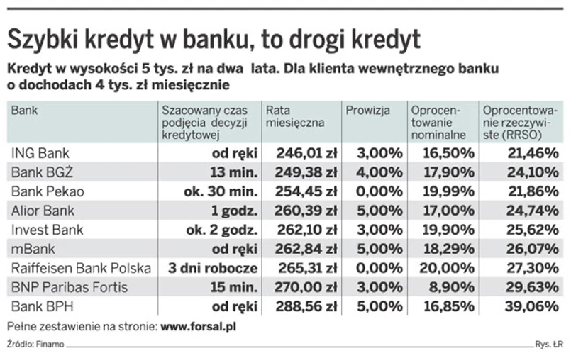 W mBanku, zaraz po zalogowaniu do systemu informatycznego, klient widzi, jaką ma zdolność kredytową i na jaką pożyczkę może liczyć. W zasadzie od ręki można otrzymać też takie informacje w Banku BPH i ING Banku Śląskim. Jednak nie we wszystkich bankach szybki kredyt jest rzeczywiście szybki. W BPS na decyzję kredytową trzeba czekać dwa dni, a w Raiffeisen Bank aż trzy dni robocze. Zwykle jednak nie trwa to w bankach dłużej niż kilkanaście minut. W praktyce, jeśli zależy nam na tym, aby bez zbędnych formalności i straty czasu otrzymać pieniądze, to najczęściej najlepszym rozwiązaniem jest skorzystanie z oferty banku, w którym mamy konto, na które wpływają nasze dochody.