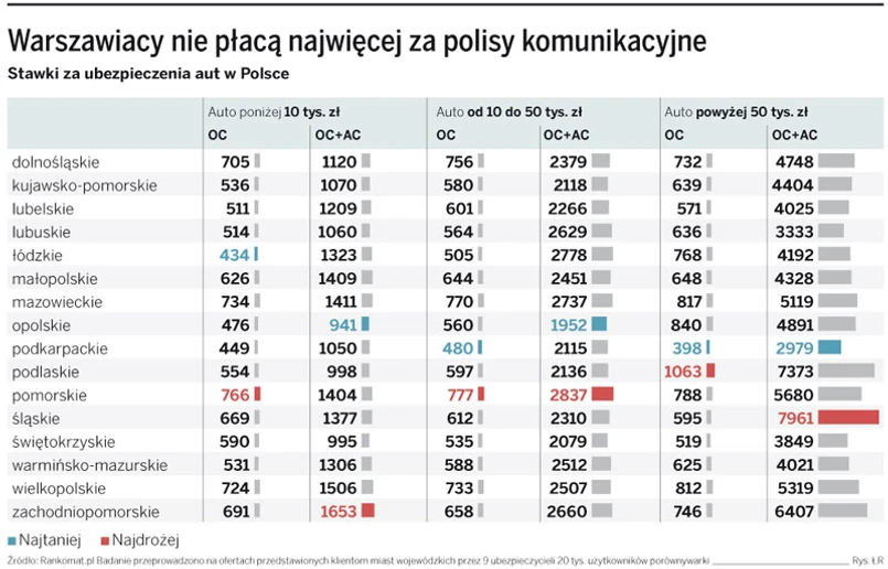 Tymczasem jeśli przenoszą się np. z Trójmiasta i kupują swoje pierwsze auto za mniej niż 10 tys. zł, w Warszawie zapłacą za polisę OC 734 zł, a u siebie 766 zł. Zamożniejsi mieszkańcy Śląska, którzy jeżdżą autem za ponad 50 tys. zł, przy przenosinach do Warszawy mogą oszczędzić jeszcze więcej. Za pakiet OC i AC u siebie zapłacą niemal 8 tys. zł, a rejestrując auto w Warszawie – nieco ponad 5 tys. zł.
