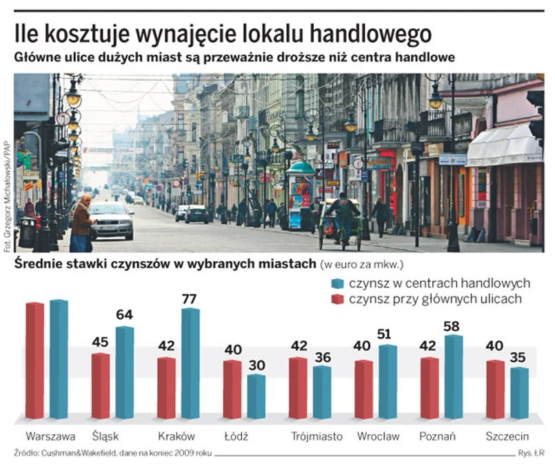 Jeszcze w zeszłym roku za 1 mkw. powierzchni handlowej w centrum Warszawy trzeba było zapłacić 90–100 euro. Dziś jest to 83 euro. A prognozowane są dalsze spadki czynszów. Głównie z powodu ograniczenia ekspansji przez banki.