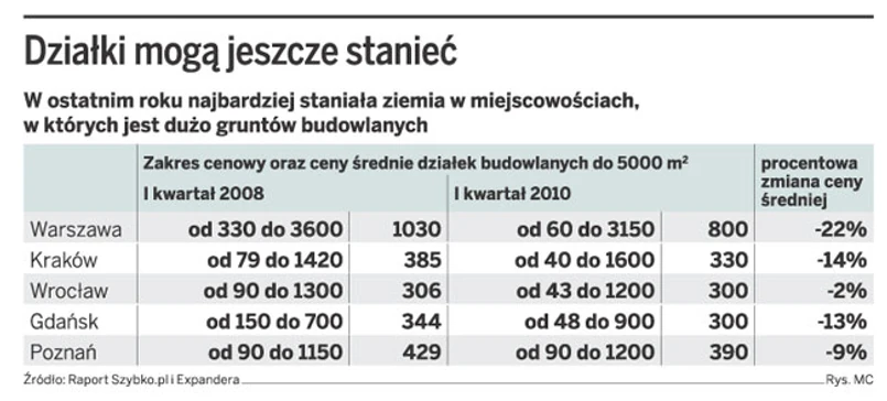 Z danych portalu Szybko.pl wynika, że w ciągu minionych 12 miesięcy najbardziej przeceniono działki w Warszawie. Średnia cena gruntów wystawionych do sprzedaży w stolicy spadła o 22 proc. (do ok. 800 tys. zł za działkę). Ponaddziesięcioprocentowe spadki odnotowano w Krakowie i Gdańsku, gdzie średnia cena to 300–330 tys. zł. Stosunkowo najmocniejszy okazał się rynek wrocławski, gdzie przecena była symboliczna i wyniosła tylko 2 proc. (średnia cena sprzedawanej działki to 300 tys. zł).