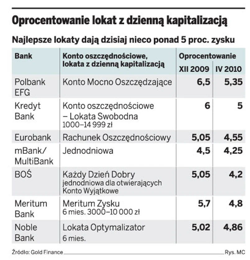 W tej chwili już tylko Polbank i Meritum (na lokatach 9- i 12-miesięcznych) dają zarobić na tego typu depozytach nieco ponad 5 proc. rocznie. Ciągle jednak lokaty jednodniowe dają większy zysk niż tradycyjne depozyty, od których trzeba jeszcze zapłacić podatek od zysków kapitałowych. Nie można wykluczyć, że obniżki oprocentowania wprowadzą kolejne banki, ale te, które zdecydowały się już na taki krok, w najbliższym czasie nie planują już tego typu ruchów.