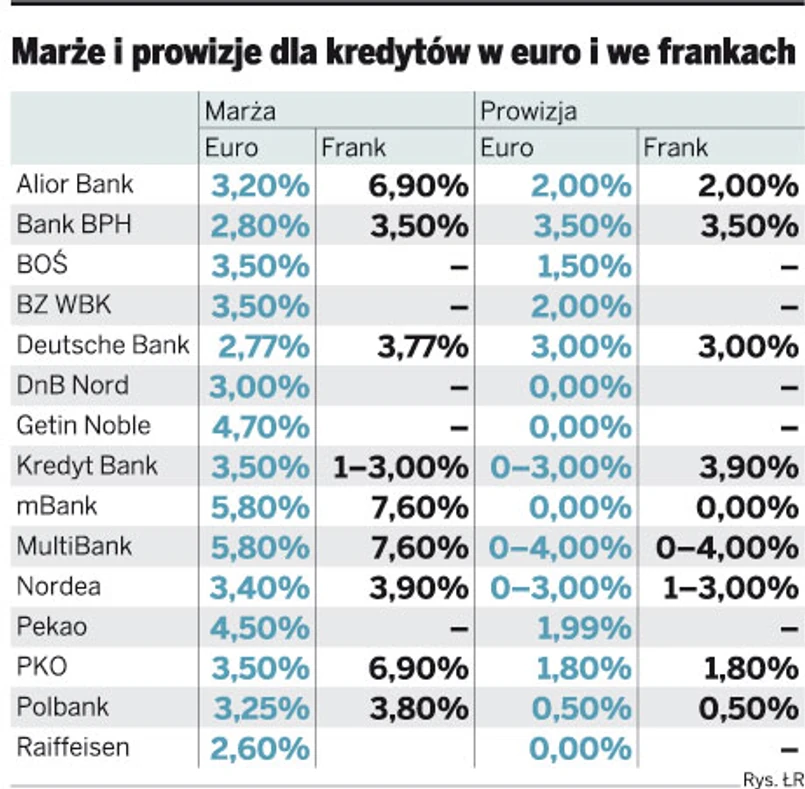 Z punktu widzenia interesów klienta banku teraz o wyborze waluty decydują marża pobierana przez bank oraz prowizja. A marże są zdecydowanie niższe w przypadku kredytów w euro niż tych denominowanych we frankach. Dla wspólnej waluty średnia marża w piętnastu bankach wynosi 3,7 proc., zaś dla franka przekracza 5,2 proc.