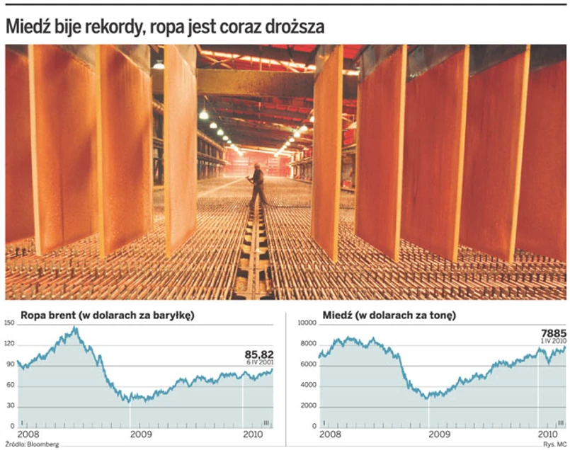 Z tego samego powodu ostatnie dni przyniosły również rekordowe wzrosty cen miedzi. Jej notowania na giełdach metali skoczyły o ponad 0,5 tys. dol. Podczas poniedziałkowej sesji na giełdzie w Londynie przekroczyły 8 tys. dol. za tonę. Tak wysoką cenę miała ostatnio miedź przed upadkiem banku Lehman Brothers w 2008 roku.