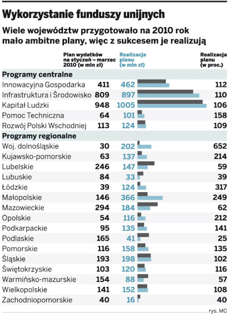 Mazowsze jednak, zamiast gonić inne regiony w wydawaniu unijnych pieniędzy, coraz bardziej od nich odstaje. Z danych Ministerstwa Rozwoju Regionalnego wynika, że mazowieckie znalazło się w niechlubnym gronie sześciu województw, które w pierwszym kwartale nie poradziły sobie z wykonaniem rządowego planu. Udało mu się wydać 184 mln złotych, co stanowi 60 proc. tego, co obiecało przekazać beneficjentom. A plany resortu wcale nie należały do trudnych.