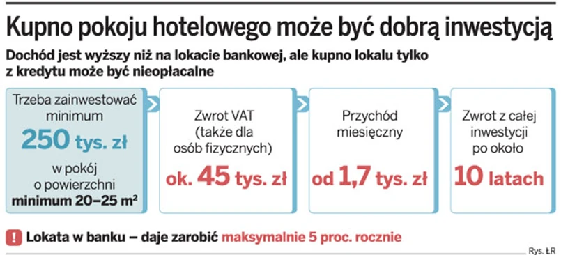 Osoby dysponujące około 250 tys. zł i gotowe zostać podatnikami VAT mogą zainwestować w pokój hotelowy. Z wynajmu można otrzymać miesięcznie około 1,7 tys. zł.