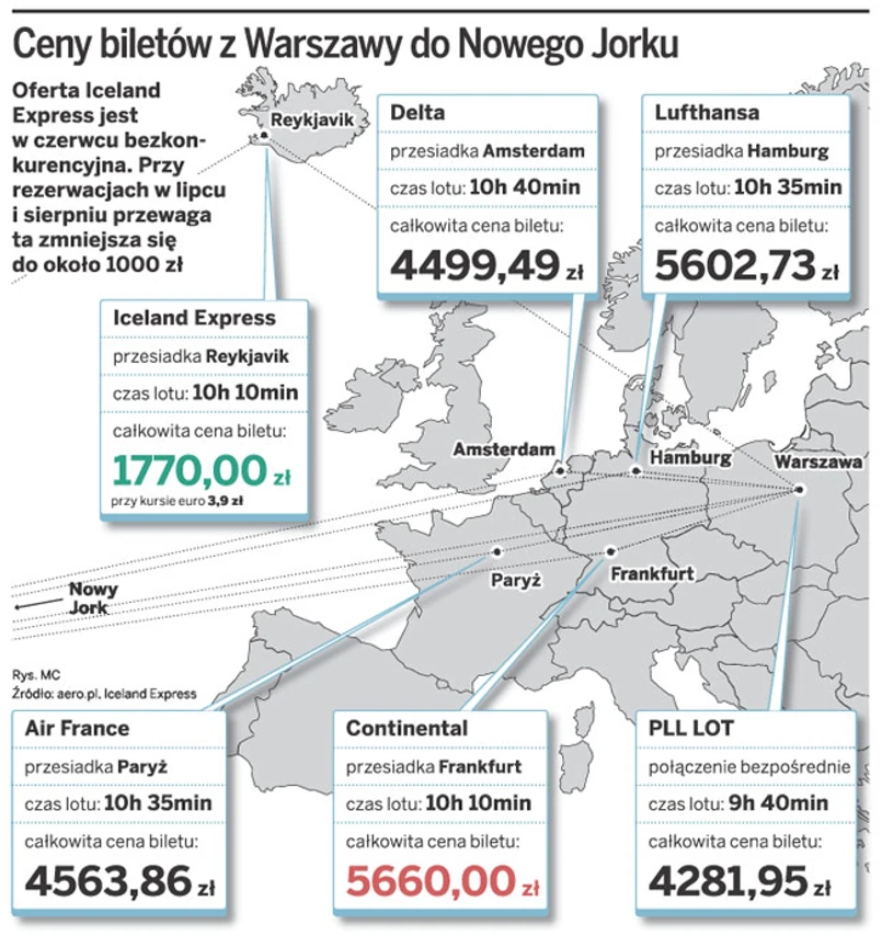 Do USA i z powrotem można było dotychczas polecieć za mniej niż 2 tys. zł tylko pod warunkiem, że udało się złapać superpromocję, albo kupowało się bilet z wielomiesięcznym wyprzedzeniem. Linie Iceland Express zapewniają, że u nich taka cena będzie standardem. Regularne połączenia z Warszawy do Nowego Jorku z przesiadką w Reykjaviku uruchamia od początku czerwca. Wczoraj bilety na jeden z pierwszych lotów można było kupić za niespełna 1,8 tys. zł. Zamawiając bilet na ten sam dzień w najtańszym na rynku PLL LOT, trzeba było wyłożyć ponad 4 tys. zł.