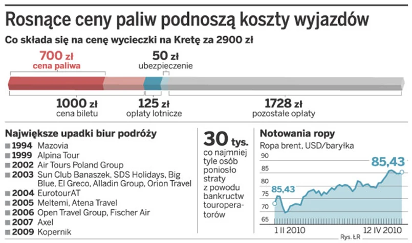 Rosnące ceny paliw to zła wiadomość dla touroperatorów, bo to oni będą musieli pokryć ewentualne dopłaty do kosztów biletów lotniczych. Dla większości biur podróży może to oznaczać utratę płynności finansowej. Szczególnie że dosłownie na palcach jednej ręki można policzyć biura podróży, które zakończyły 2009 rok zyskiem.