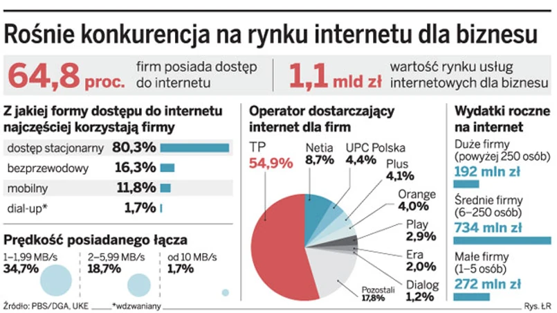 TP liczy na to, że cięcia przyciągną klientów i zwiększą przychody z rynku biznesowego. Ma on spory potencjał, bo internetu nie ma wciąż 35 proc. firm. Konkurencja jest jednak ogromna. Oprócz TP, o klientów biznesowych walczą nie tylko Netia czy Dialog, ale także wyspecjalizowane w tym rynku firmy: m.in. ATM, Exatel czy Crowley Data Polska. Coraz mocniejsi są operatorzy kablowi, tacy jak UPC Polska czy Grupa Aster.