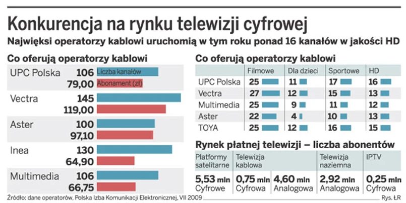 Dla operatorów kablowych pozytywnym sygnałem jest jednak to, że coraz więcej osób wybiera dostęp do droższej cyfrowej telewizji. Zarówno w UPC Polska, jak i Vectrze korzysta już z tej oferty po 250 tys. klientów. Inwestycje w cyfryzację traktuje strategicznie, godząc się na wysokie koszty. Kanał w jakości HD kosztuje operatora nawet cztery razy więcej niż ten sam w obecnej jakości standardowej.