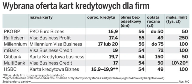 Dla mikrofirmy – karta kredytowa z limitem rzędu kilkudziesięciu tysięcy złotych. Dla większej – karty przedpłacone dla lepszej kontroli kosztów przedsiębiorstwa. Według Visy, posiadającej ponad dwie trzecie rynku kartowego w Polsce, liczba kart dla przedsiębiorców przyrasta w szybszym tempie niż kart dla klientów detalicznych.