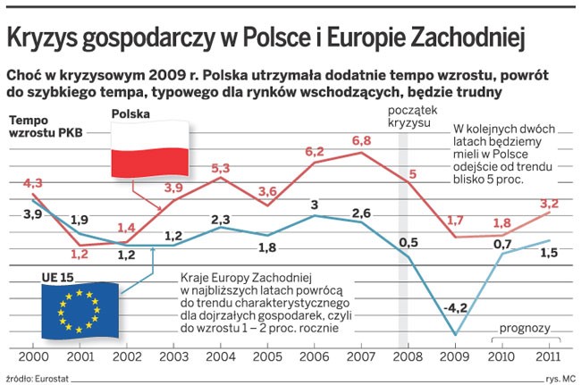 Polska należy do grupy krajów wschodzących, doganiających najbardziej rozwinięte państwa. Przed kryzysem rozwijała się dość szybko, podobnie powinno być w następnych latach. W tej sytuacji skutki kryzysu rozłożone na 2 – 3 lata nie przesuwają nam tempa wzrostu gospodarczego poniżej zera. Takie postawienie sprawy każe inaczej spojrzeć na nasz dotychczasowy domniemany sukces w walce z kryzysem. Mieliśmy w zeszłym roku w Polsce tempo na poziomie poniżej 2 proc. Patrząc na dwa kolejne lata, będziemy mieli łącznie w latach 2009 – 2011 odejście od trendu blisko 5 proc., w granicach 5 – 6 punktów procentowych PKB.