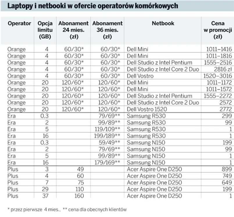 Przy najdroższych abonamentach w Erze i Plusie można dostać komputer przenośny za 1 zł. Najszerszą ofertę przenośnych komputerów z abonamentem internetowym w promocji ma Orange. W odróżnieniu jednak od Ery i Plusa nie oferuje sprzętu za złotówkę, ale kilkusetzłotowy upust. W przypadku tańszego abonamentu za 60 zł miesięcznie rabat ten to 183 zł brutto od ceny rynkowej, a w przypadku droższego abonamentu jest to kwota 427 zł brutto.