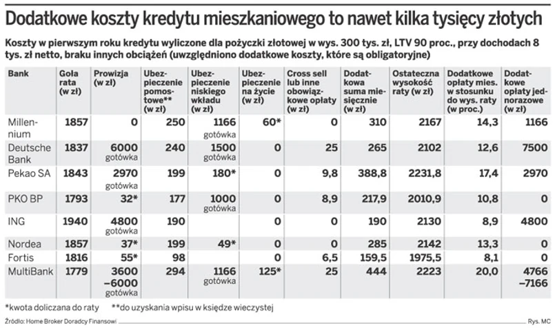Wspólnie z Home Broker, na podstawie oferty wybranych banków, sprawdziliśmy, ile wynoszą te dodatkowe koszty w pierwszym roku spłaty pożyczki. Najbardziej bolesne są oczywiście opłaty, które trzeba ponieść jeszcze przed udzieleniem kredytu. Chodzi przede wszystkim o prowizję, która w przypadku kredytu wynoszącego 300 tys. zł może wynosić od 3 do 6 tys. zł. Nie wszystkie banki umożliwiają jej skredytowanie i doliczanie do rat.