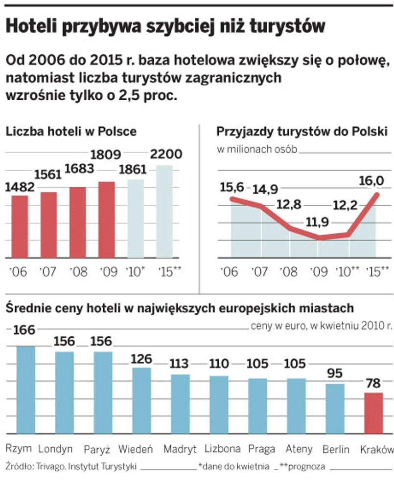 W ciągu pięciu lat w Polsce przybędzie 400 nowych hoteli. Do 2015 roku ich liczba wzrośnie do 2,2 tys., a liczba pokoi zwiększy się z 90 tys. do 130 tys. Tymczasem ruch turystyczny nie będzie wykazywał tak wysokiej dynamiki. Prognozy Instytutu Turystyki mówią, że w 2015 roku nasz kraj odwiedzi około 16 mln turystów, czyli niewiele więcej niż w 2006 roku.