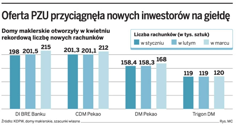 O dużym zainteresowaniu inwestorów świadczy liczba nowych rachunków, które założyli od startu zapisów na PZU. W trzech największych (pod względem ilości prowadzonych kont) domach maklerskich – DI BRE, CDM Pekao i DM Pekao – od 20 kwietnia otworzono ich 33 tys. Za ich pośrednictwem można maksymalnie nabyć prawie 1 mln akcji towarzystwa. Do tego należy doliczyć inwestorów, którzy także zapisali się na akcje PZU, a mieli już wcześniej kontakt z giełdą.
