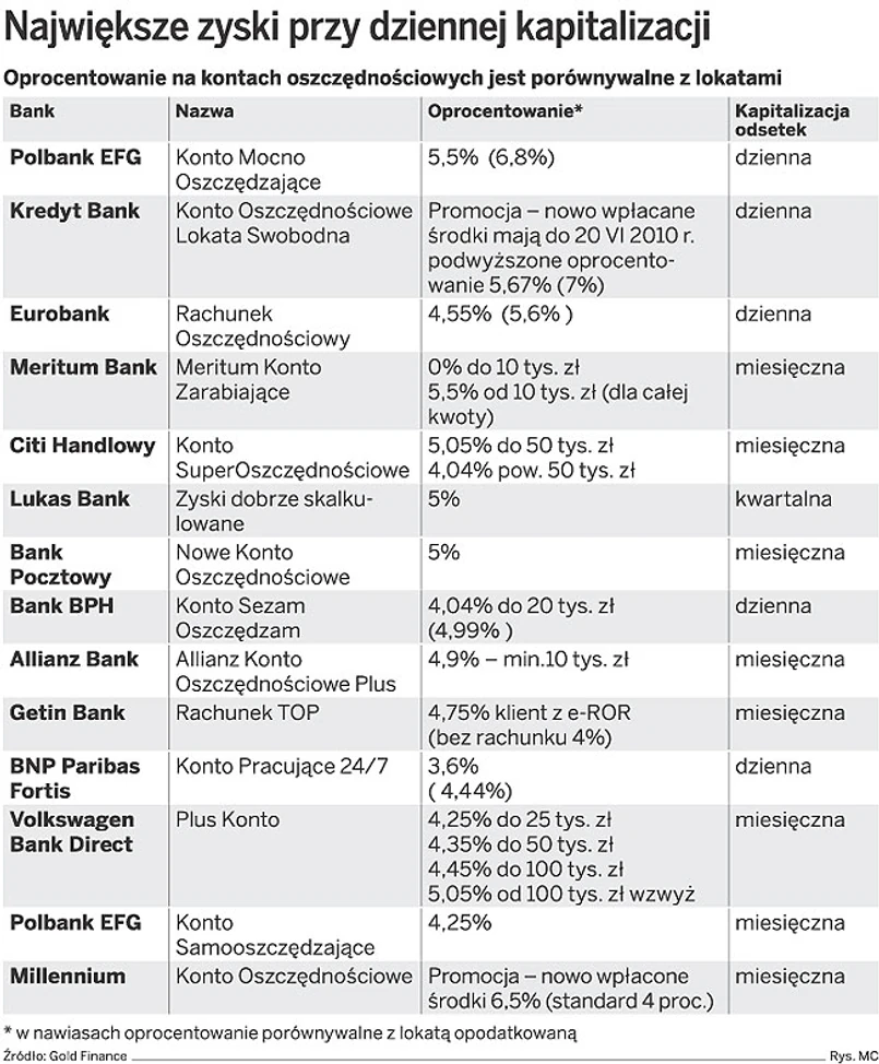 Na najlepszych kontach oszczędnościowych oprocentowanie przekracza 5,5 proc., co przy dziennej kapitalizacji, pozwalającej uniknąć płacenia 19-proc. podatku od zysków kapitałowych, można porównać z tradycyjnymi lokatami z oprocentowaniem w wysokości 7 proc. Takich ofert depozytów na rynku niestety już nie ma.