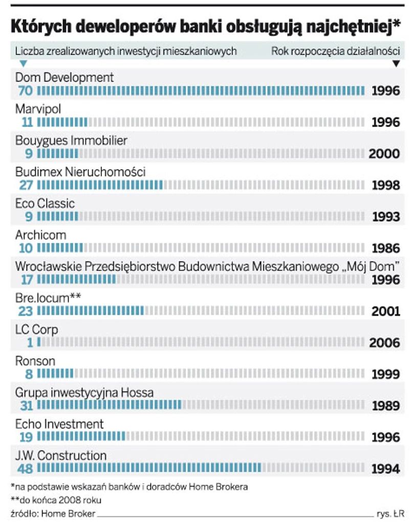 W nieoficjalnych rozmowach bankowcy potwierdzają, że prowadzą takie listy. Aby się na nich znaleźć, deweloper musi wykazać się doświadczeniem w branży budowlanej i dobrą historią w kontaktach z bankami. Za najbardziej wiarygodnych deweloperów uznawani są ci, których akcje są notowane na giełdzie lub których właściciele to spółki publiczne. Na trzynastu deweloperów, którzy najczęściej pojawiają się na pozytywnych listach banków lub których wskazują doradcy Home Brokera, na co dzień współpracujący z bankami, pięć firm to spółki giełdowe, a kolejne cztery to firmy związane ze spółkami giełdowymi (czasami zagranicznymi). W przypadku Bre.locum i LC Corp na ich korzyść działa też fakt, że ich udziałowcy to instytucje finansowe. Eksperci podkreślają, że o ile pojawienie się dewelopera na pozytywnej liście prowadzonej przez bank ma niewielki wpływ na ewentualne decyzje dotyczące finansowania samej budowy, to ma duże znaczenie przy udzielaniu kredytów dla osób fizycznych.