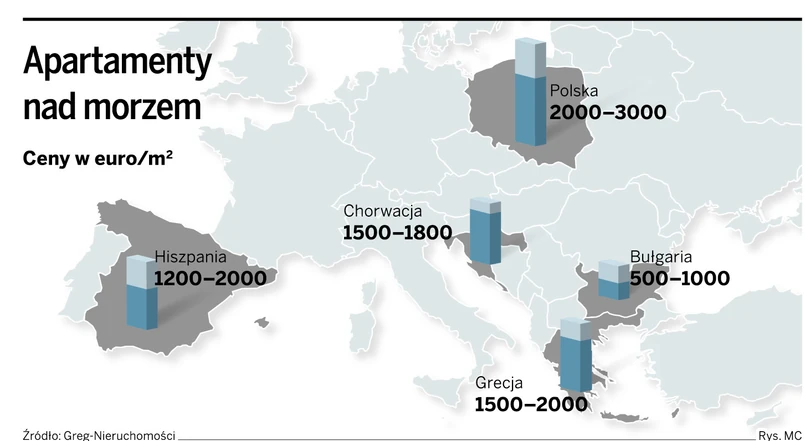 Polacy tradycyjnie najchętniej kupują apartamenty w Hiszpanii, Chorwacji i Bułgarii. Obecny kryzys odstrasza potencjalnych inwestorów od rynku greckiego. Zasadniczo kupno mieszkania w kurorcie nad ciepłym morzem okazuje się porównywalną, a nawet tańszą inwestycją niż kupno lokalu tej samej wielkości w dużym mieście w Polsce czy w atrakcyjnych miejscowościach na polskim Wybrzeżu (ok. 2–3 tys. euro za metr). Ceny nieruchomości w Bułgarii zaczynają się od 500 euro za metr, choć w tych najbardziej atrakcyjnych lokalizacjach są nawet dwa razy wyższe. Niewielki 2-pokojowy lokal w Słonecznym Brzegu może jednak kosztować ok. 40–50 tys. euro (200 tys. zł). Warto jednak zwrócić uwagę, że powierzchnia mieszkań jest tam liczona nieco inaczej niż u nas.